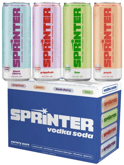 Say hello to Sprinter—your new main squeeze. Founded by Kylie Jenner, Sprinter Vodka Soda blends premium vodka, real fruit juice, and sparkling water into bold, refreshing perfection. Each can delivers vibrant fruit-forward flavor in four juicy varieties: Black Cherry, Peach, Grapefruit, and Lime. At just 100 calories, gluten-free, and with no added sugar, this 4.5% ABV variety pack is your go-to for crisp, clean, and effervescent fun. Sprinter is the can for every plan.